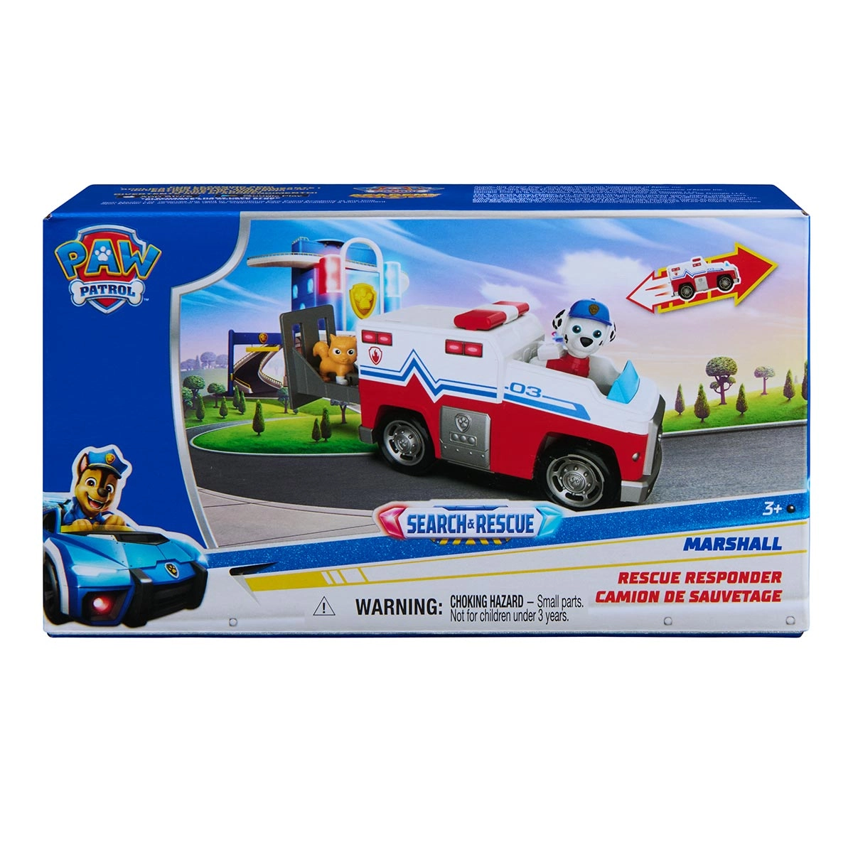 O veículo Search & Rescue da Patrulha Canina com Marshall leva cada missão a aventuras cheias de ação. Com propulsão por fricção, o carro ganha velocidade instantânea ao ser puxado para trás, pronto para transportar amigos animais em segurança. O conjunto inclui Marshall e seu amigo animal, com um veículo sólido cheio de detalhes coloridos que estimulam a imaginação, permitindo recriar resgates emocionantes e aventuras heroicas inspiradas nas histórias da Patrulha Canina.