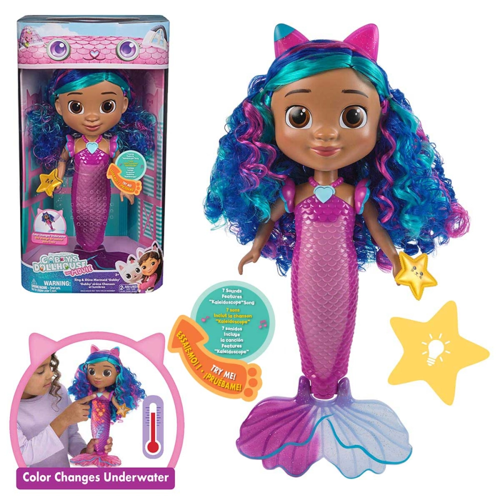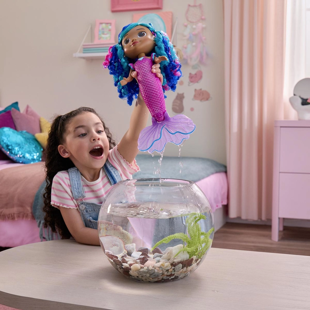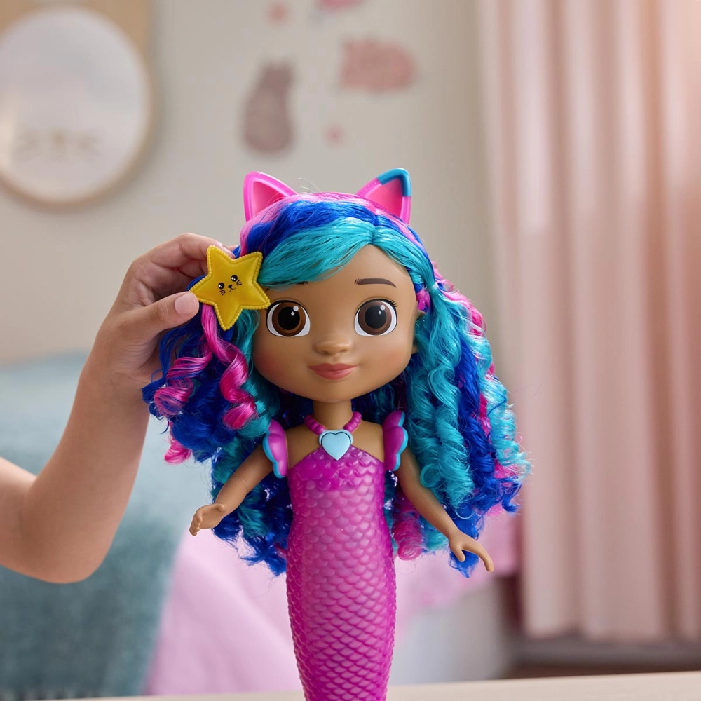 Colorida como um arco-íris e mágica como o fundo do mar, essa sereia de Gabby’s Dollhouse: The Movie é puro encanto. Com cabelos em tons de azul e violeta, cauda que muda de cor conforme a temperatura da água e detalhes que brilham como as histórias da Gabby, ela transforma a brincadeira em um espetáculo visual. A tiara com orelhinhas e a estrela luminosa são removíveis, criando novas possibilidades a cada momento de imaginação. Com 14 sons suaves, luzes encantadoras e um visual que hipnotiza, essa boneca oferece uma experiência sensorial completa.