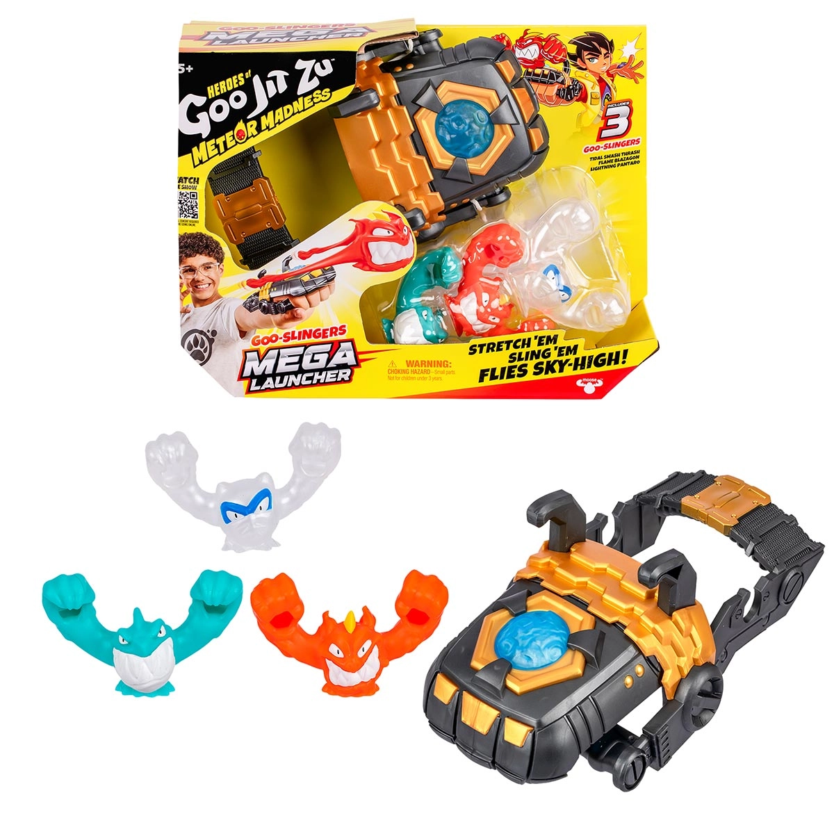 O Heroes of Goo Jit Zu: Meteor Madness Goo-Slingers Mega Launcher apresenta 3 figuras elásticas exclusivas — Blazagon, Pantaro e Cacticus — com 5 cm de altura, que esticam até o limite antes de serem lançadas para batalhas aéreas emocionantes. Com o Mega Launcher, as figuras podem ser carregadas, esticadas e lançadas para momentos de diversão dinâmica. Inspirado em episódios da série no YouTube, este conjunto combina criatividade e ação elástica. A linha Meteor Madness conta com 31 Goo-Slingers diferentes para ampliar as possibilidades de brincadeira. O kit inclui 1 playset Mega Launcher, 3 figuras esticáveis e instruções.