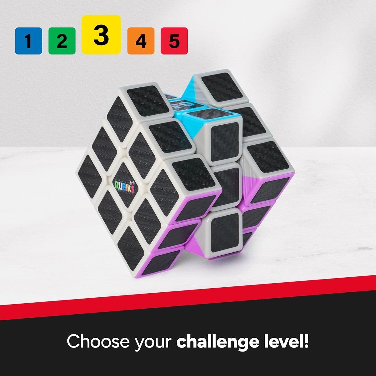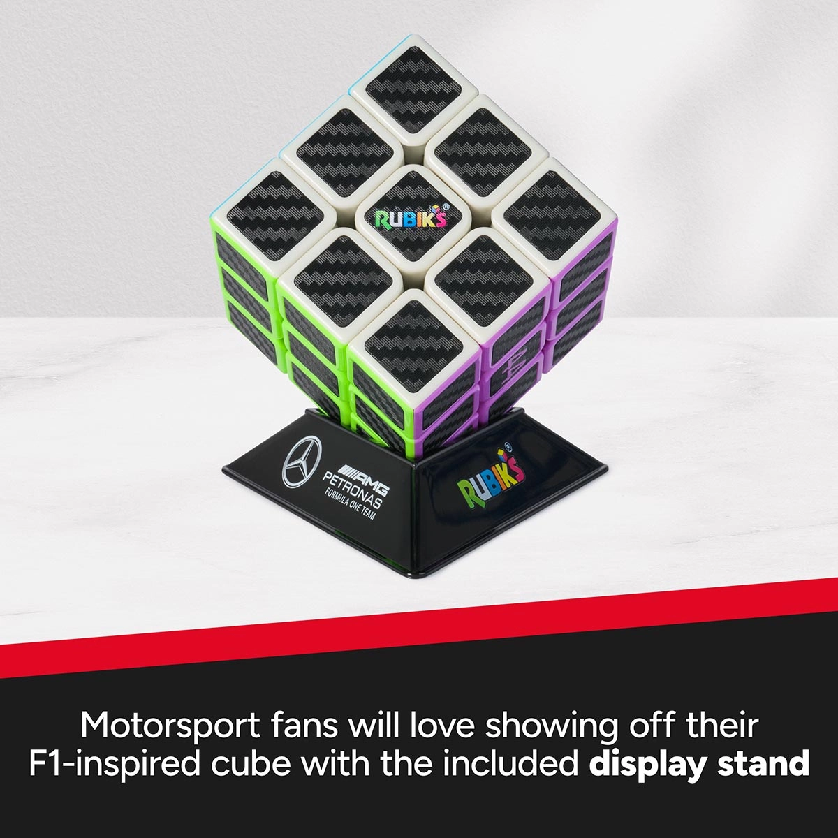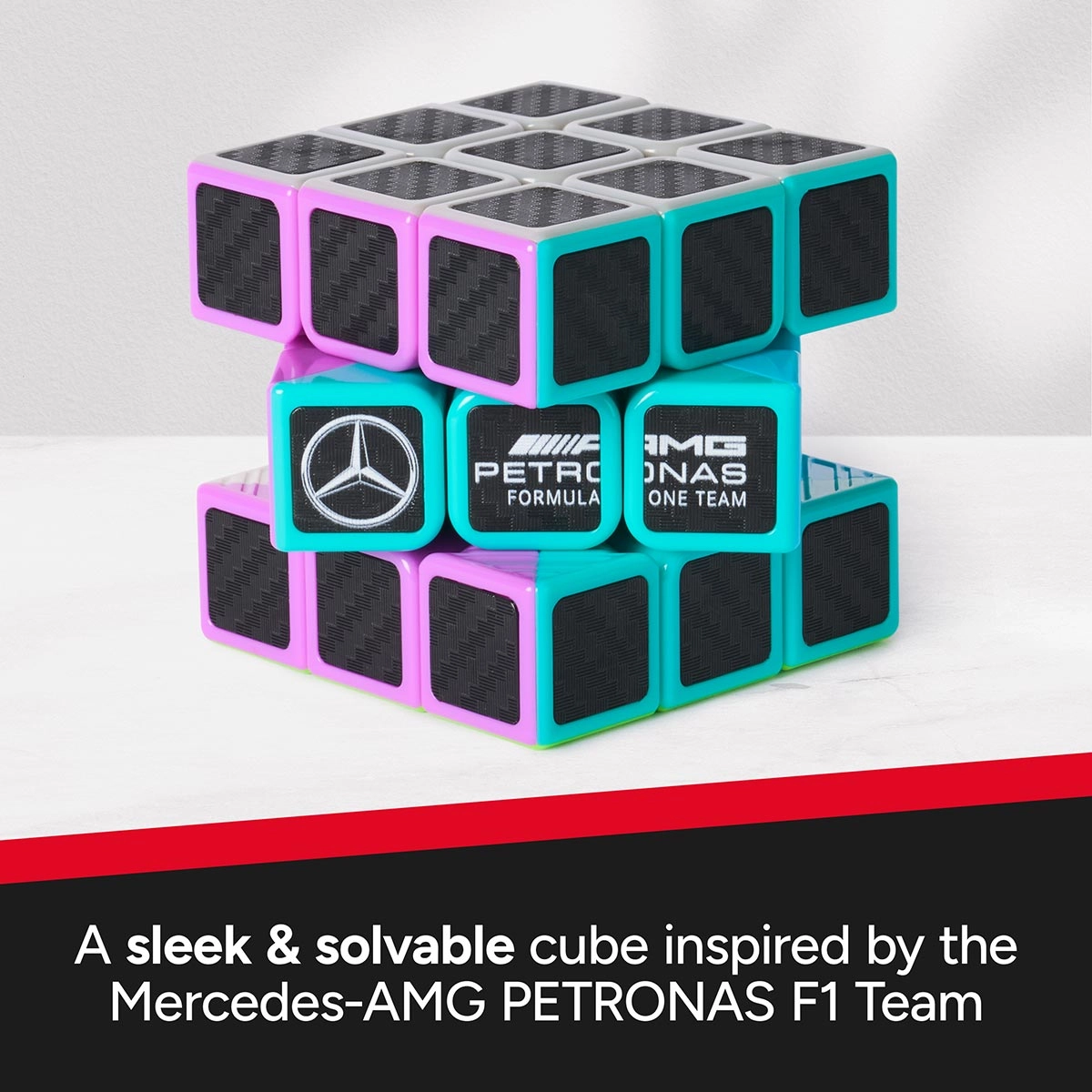O Cubo Rubik’s 3x3, desenvolvido em parceria com a Mercedes-AMG PETRONAS Formula One Team, apresenta um design inspirado na Fórmula 1, com a superfície de impressão em fibra de carbono e o logotipo da equipe. Baseado no cubo origi